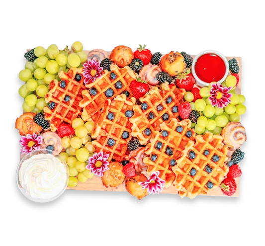 Belgian waffles, mini cinnamon rolls, mini muffins, grapes, berries, seasonal fruit, whipped cream, and syrup Peanut, Wheat