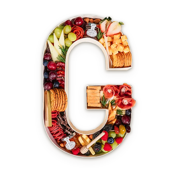 Customize your order with a number or letter charcuterie board. Items included in the letters are the same as signature fig+brie board items